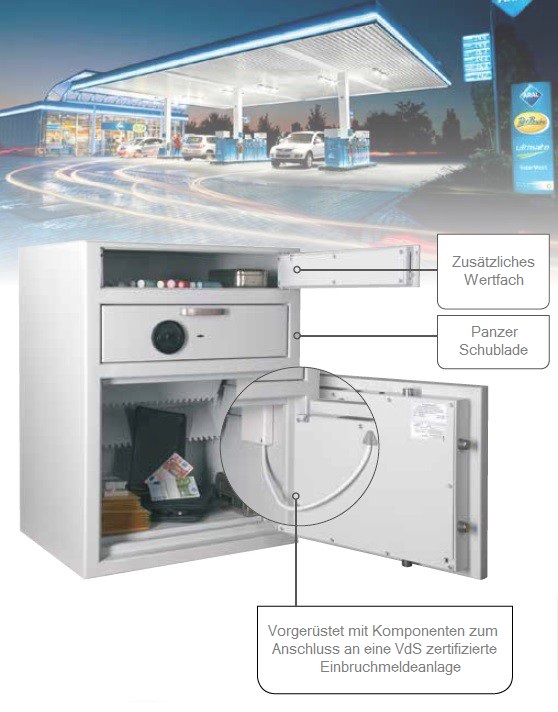 In allen Betrieben mit hohem Bargeldaufkommen, wie z. B. Autohäusern, Kfz Werkstätten und Tankstellen, ist der sichere Umgang mit Tageseinnahmen und Wechselgeld ein wichtiges Thema. Eine ideale Lösung, um größere Geldbeträge auch während des laufenden Betriebs Diebstahl- und Überfall sicher unterzubringen, sind Deposit- und Wertschutz Tresore. Systeme dieser Art bieten den Vorteil, Bargeld, aber auch Fahrzeugschlüssel, Papiere, Auftragstaschen und Geräte o. ä. sicher verwahren zu können. Hierfür bietet Neuscheler praktische, über viele Jahre sich in der Praxis bewährte Lösungen an.